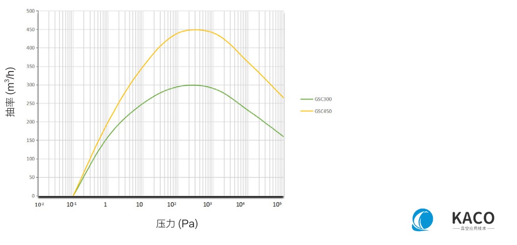 GSC300D螺桿干泵的抽速曲線圖展示了該泵在不同壓力下的抽速變化情況,為用戶提供了直觀的性能參考。